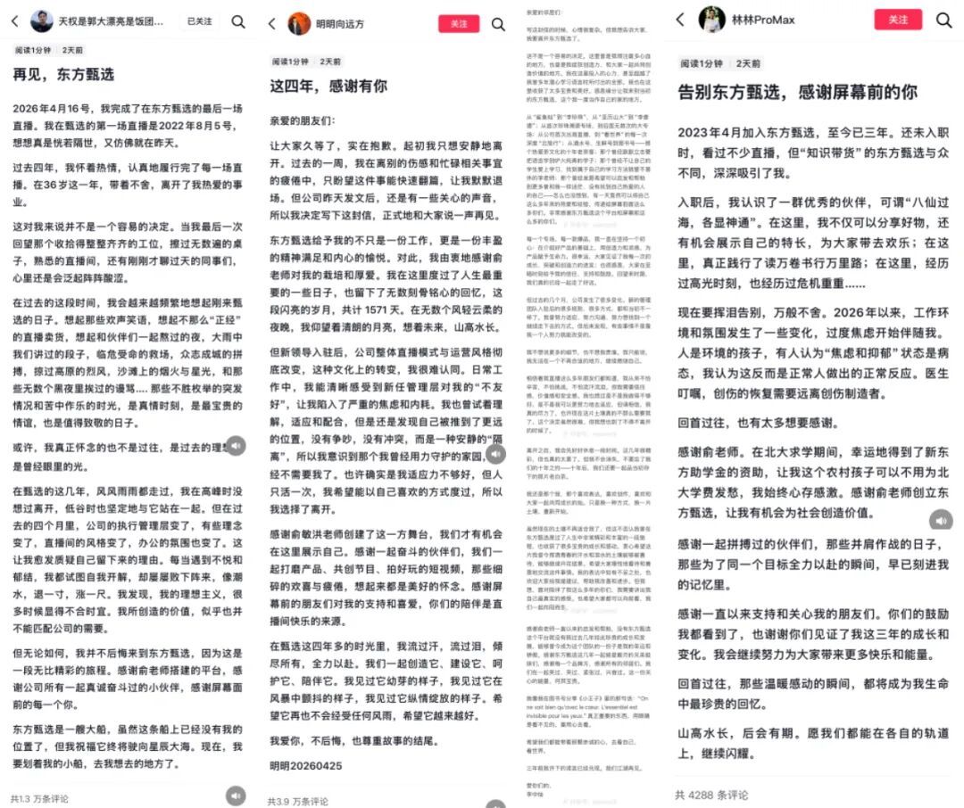 4月25日,东方甄选旗下明明、天权、中灿、林林四位人气主播相继在社交平台发文,宣布从东方甄选离职,而在他们各自的告别信中,公司管理层的变动和发展理念的变化成为被反复提及的离职原因。