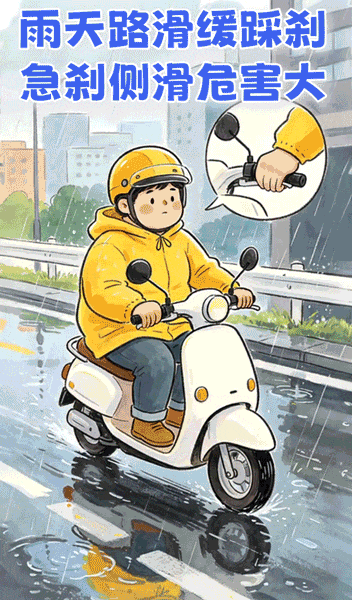 雨天路面摩擦系数降低,急刹易导致车轮抱死、车身侧翻,需渐进式踩刹,预留充足刹车距离。轮胎花纹可排水防滑,花纹磨损过多时,排水能力下降,易打滑,需及时更换轮胎。