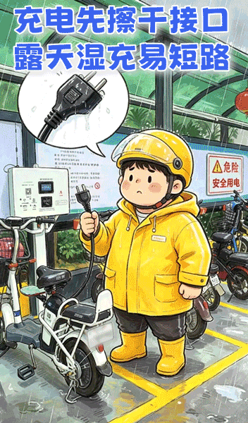 电动自行车电池、充电口遇水易短路,雨天避免露天充电,充电前检查充电口是否干燥,雨后及时擦干。